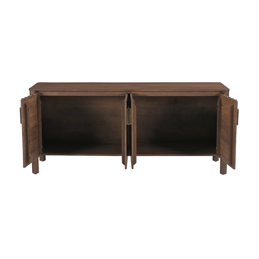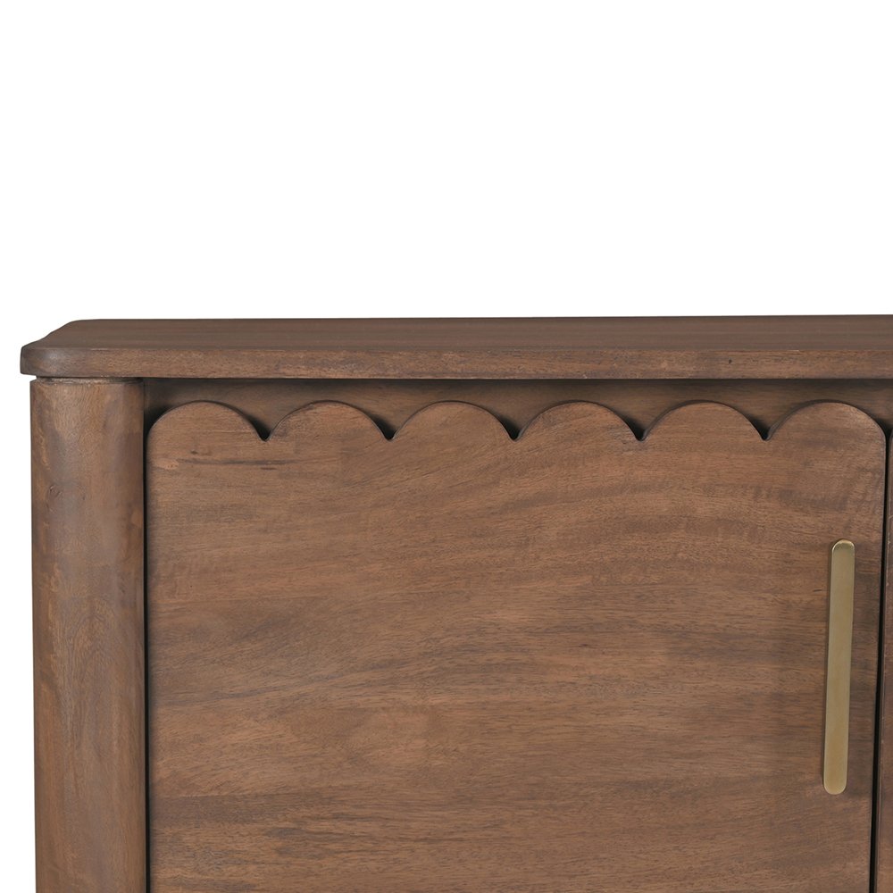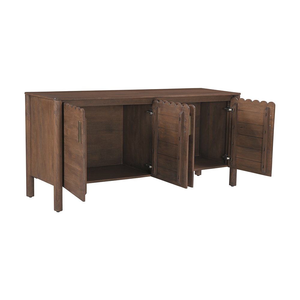 The Covefield 4-drawer sideboard. Meticulously crafted, its elegant form is defined by sleek, geometric curves that add a captivating touch of modernity. The post legs stand as pillars of strength, grounding the sideboard with their understated presence. A showcase of intricate scalloped edge details and heavy brass handles, these delicate elements lend a timeless charm reminiscent of classical influences.