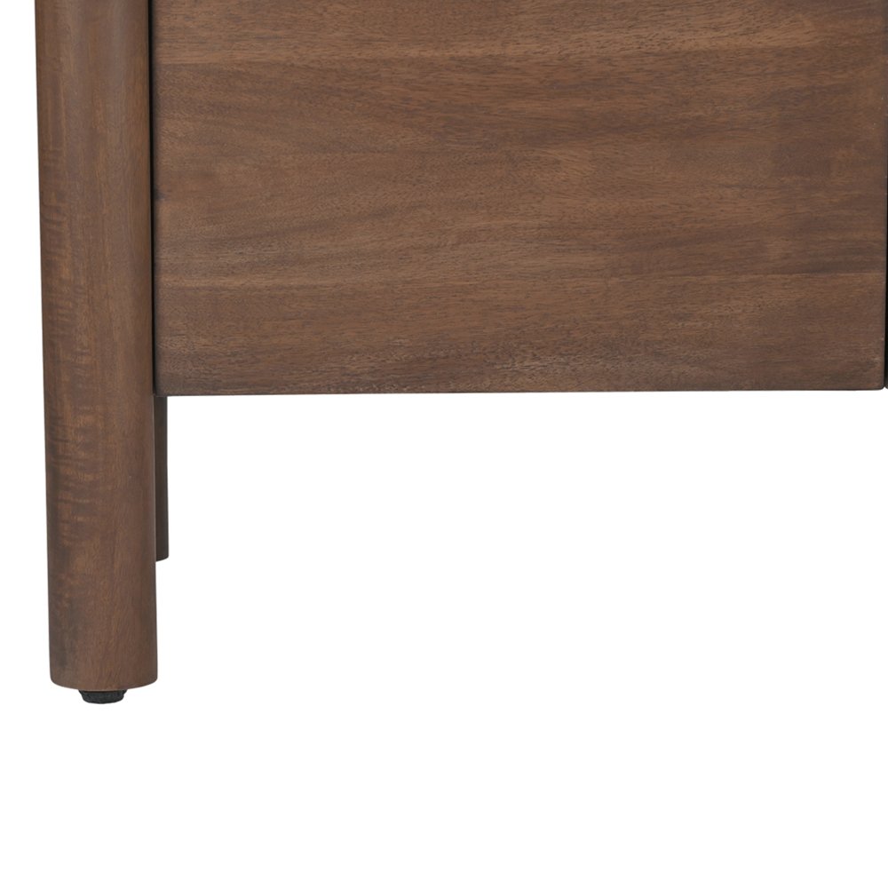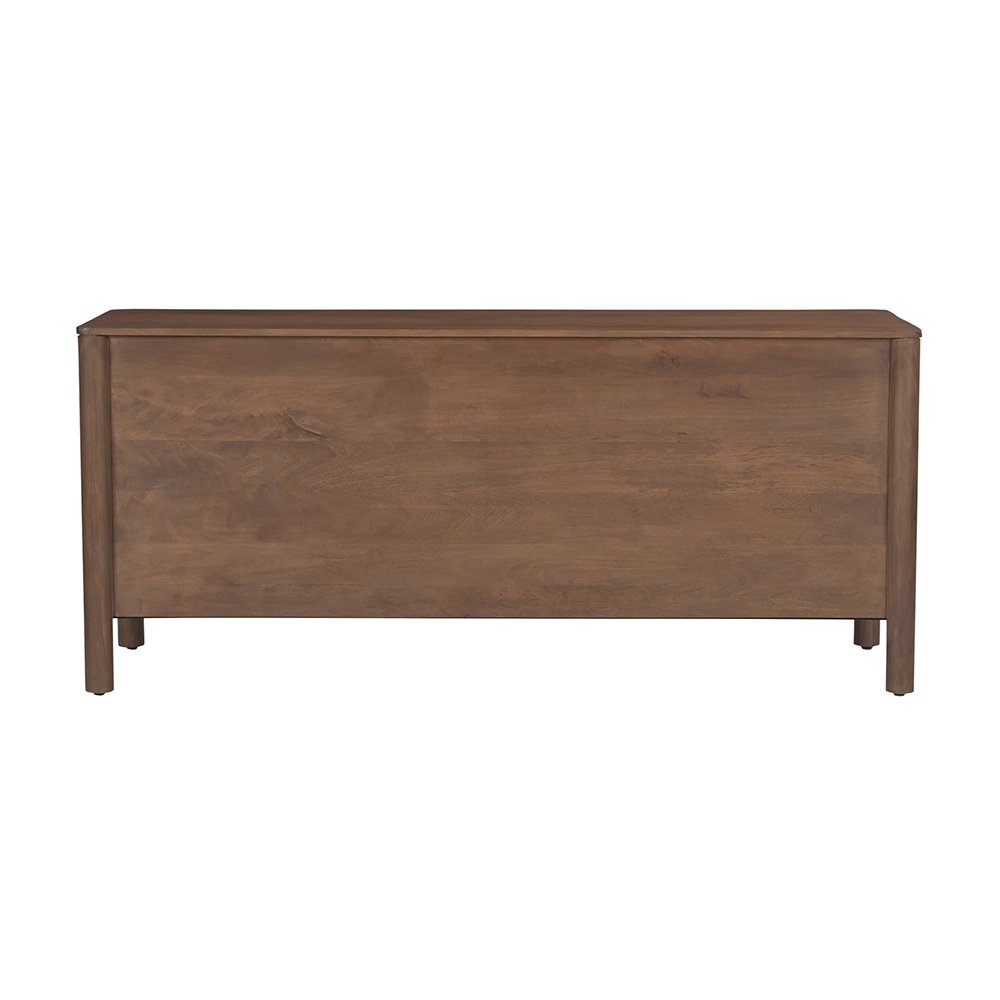 The Covefield 4-drawer sideboard’s elegant form is defined by sleek, geometric curves that add a captivating touch of modernity, while the monolithic round legs stand as pillars of strength, grounding the sideboard.