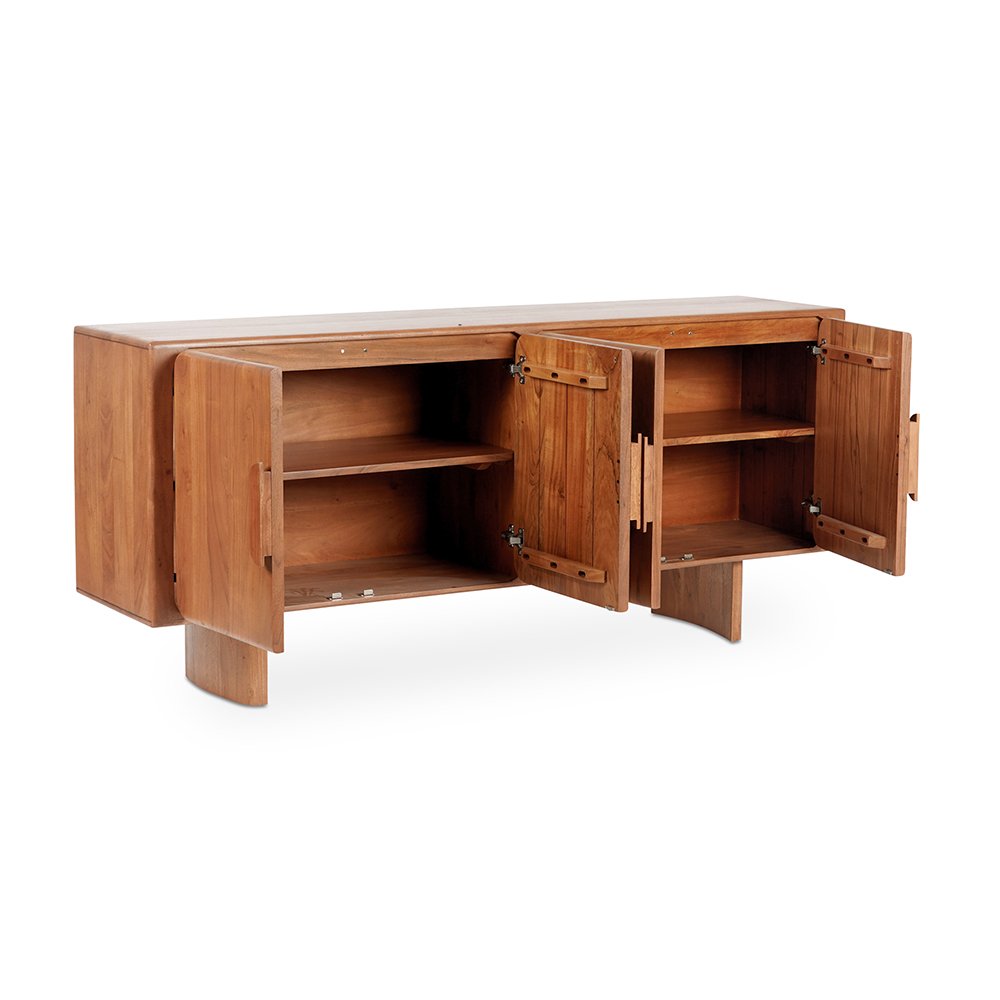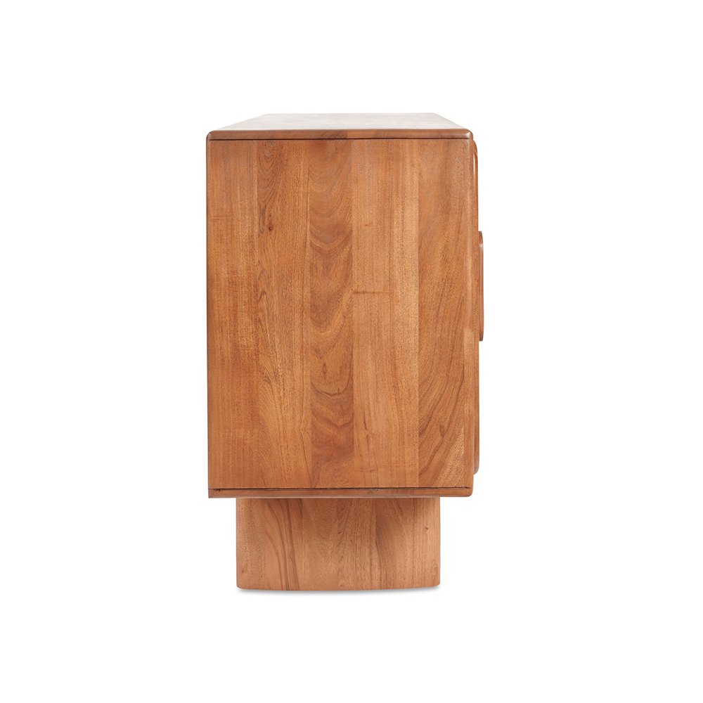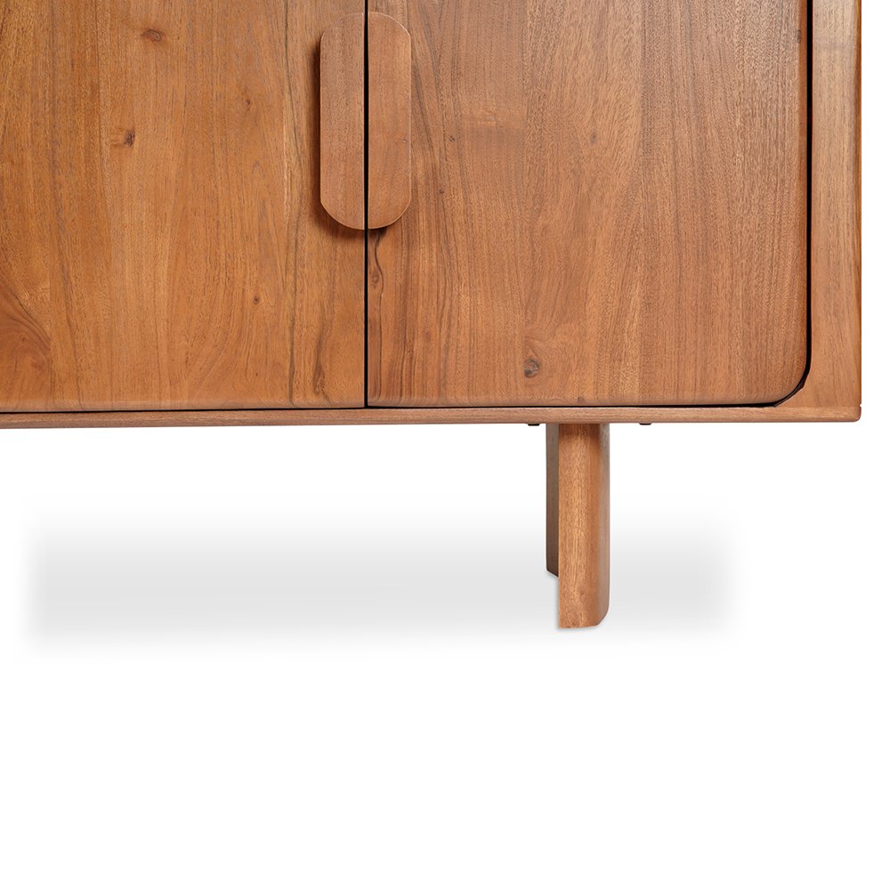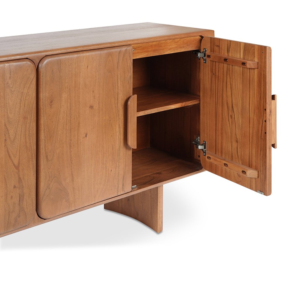 Crafted from Acacia wood, the Everline sideboard features round curved doors with glass fronts and magnetic door catches for effortless functionality.
