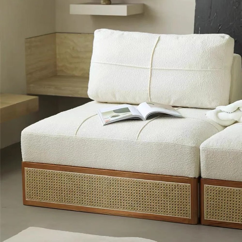 Comfort and style meet on this vintage-inspired Rattan Storage Modular Piece Sofa. A curvy silhouette, classic rolled arms and loose seat cushion are paired with an exposed wood frame for a fresh new take. Upholstered in a texture-forward boucle performance fabric. Performance fabrics are specially created to withstand spills, stains, high traffic and wear, ensuring long-term comfort and unmatched durability.