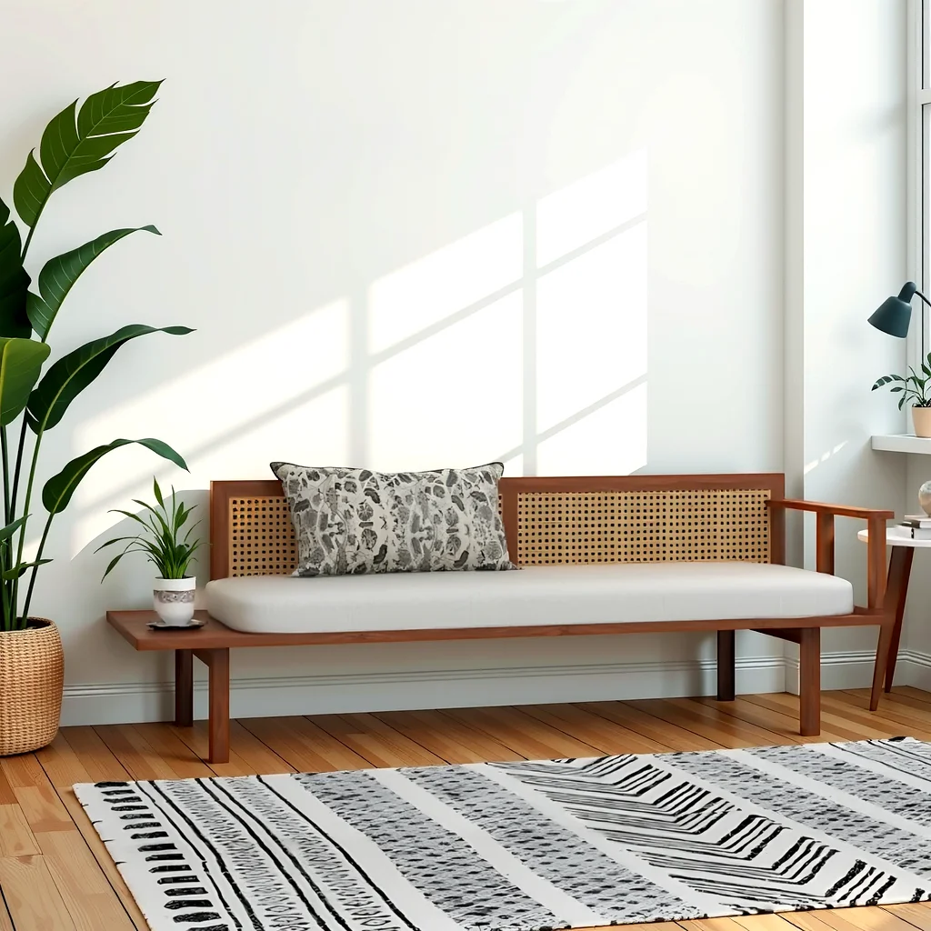 A cane bench sofa is a piece of furniture that combines the traditional design elements of a bench and a sofa, with the prominent use of cane in its construction.
