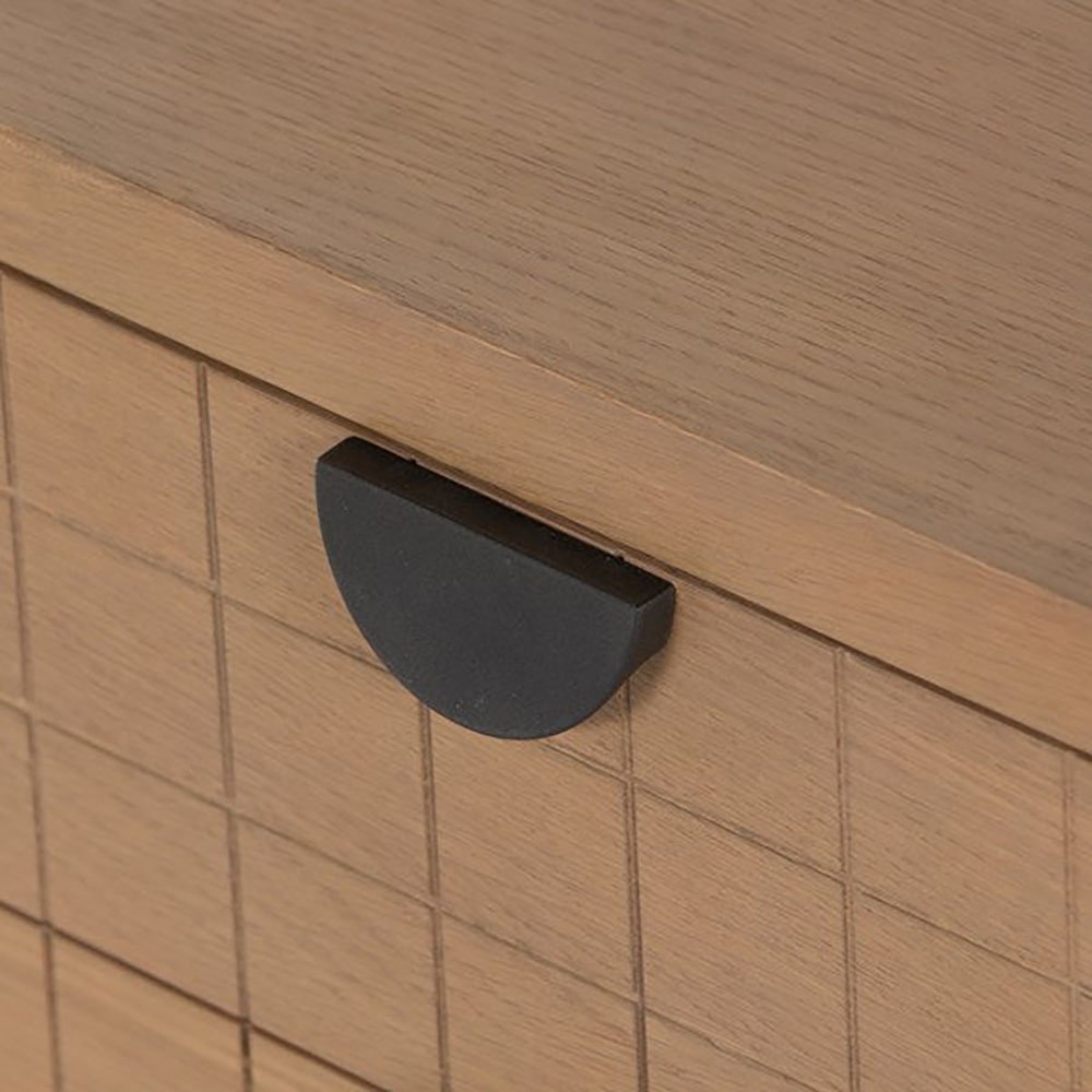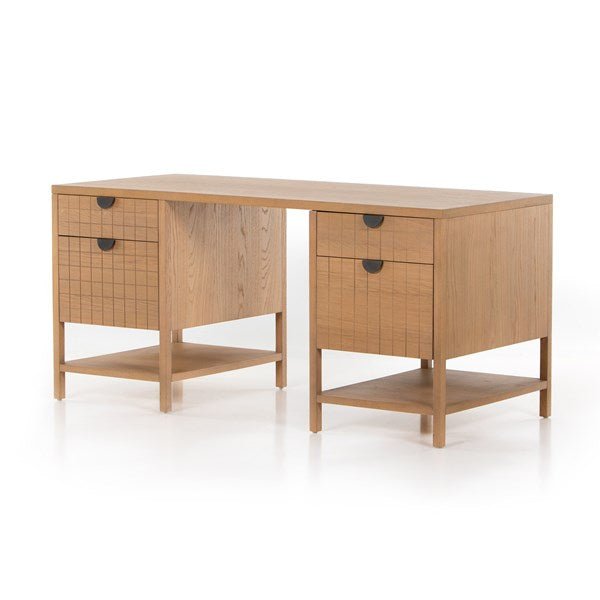 Made from burnished Mango Wood with a geometric grid pattern inspired by Seventies design, a clean-lined executive desk features half-moon iron hardware, roomy drawers and open shelving for maximum storage space