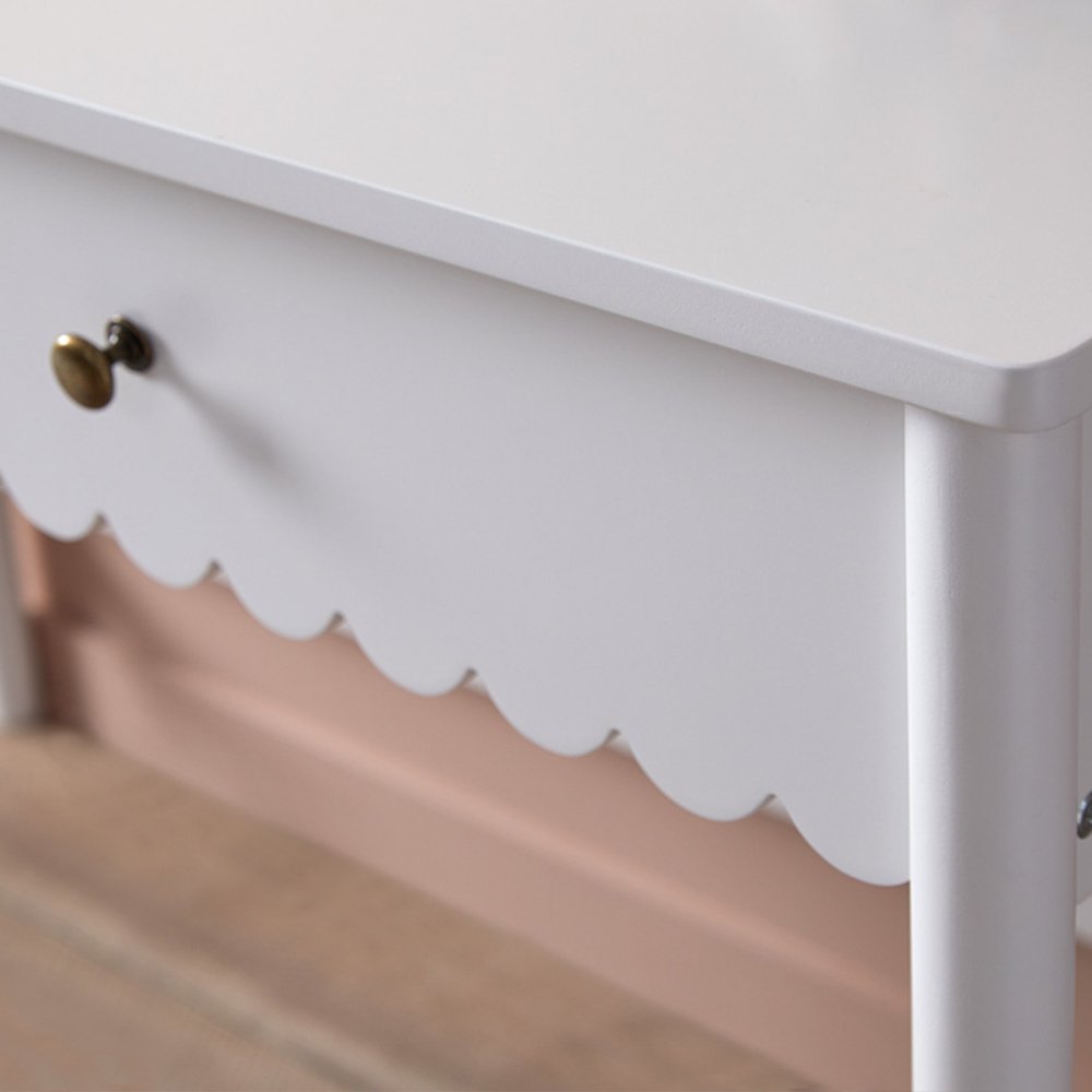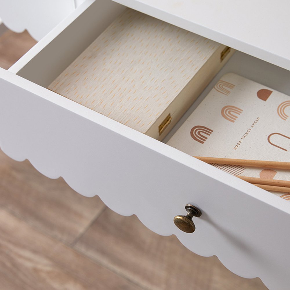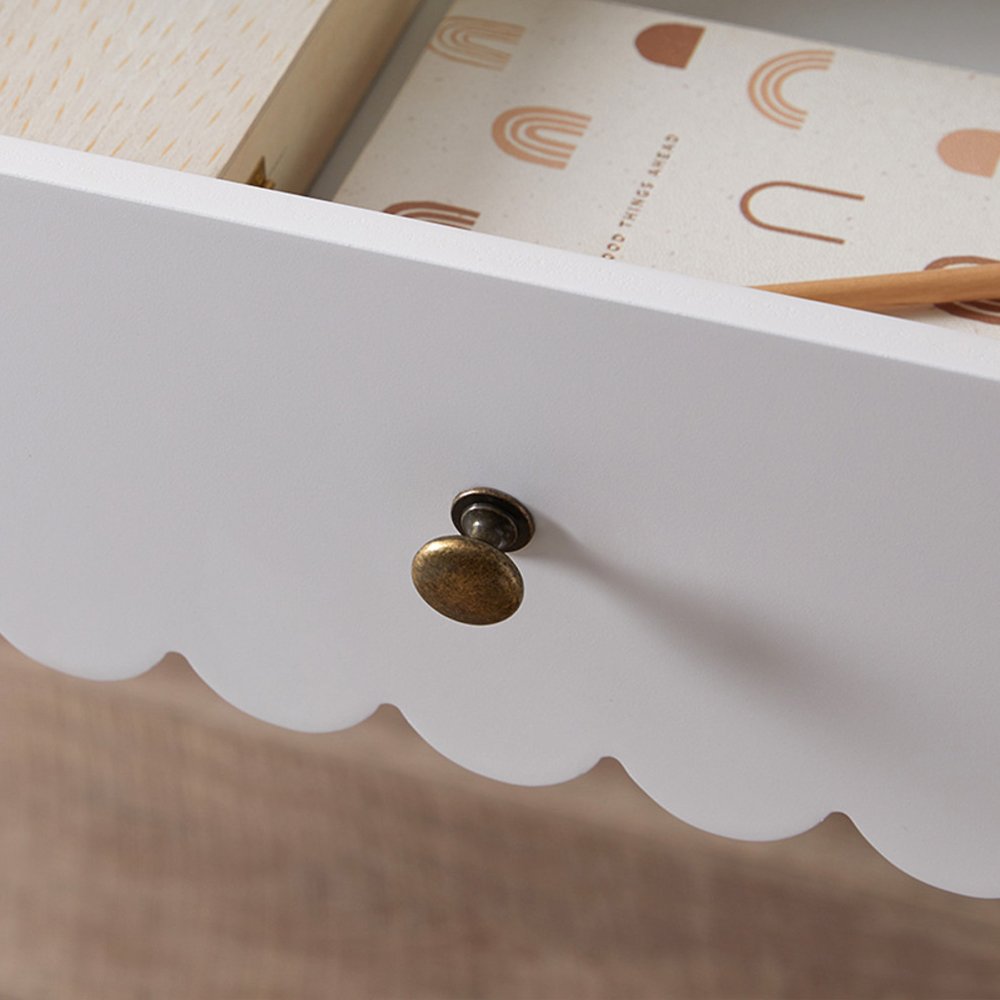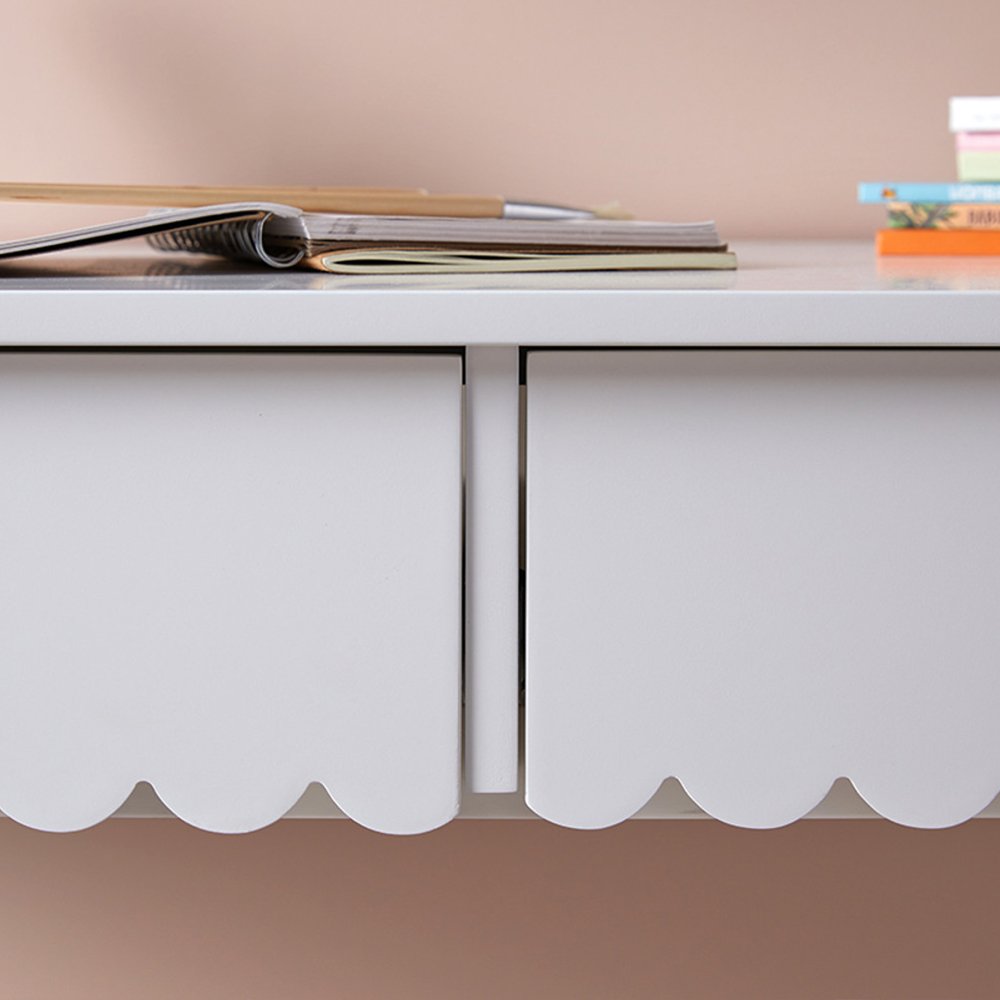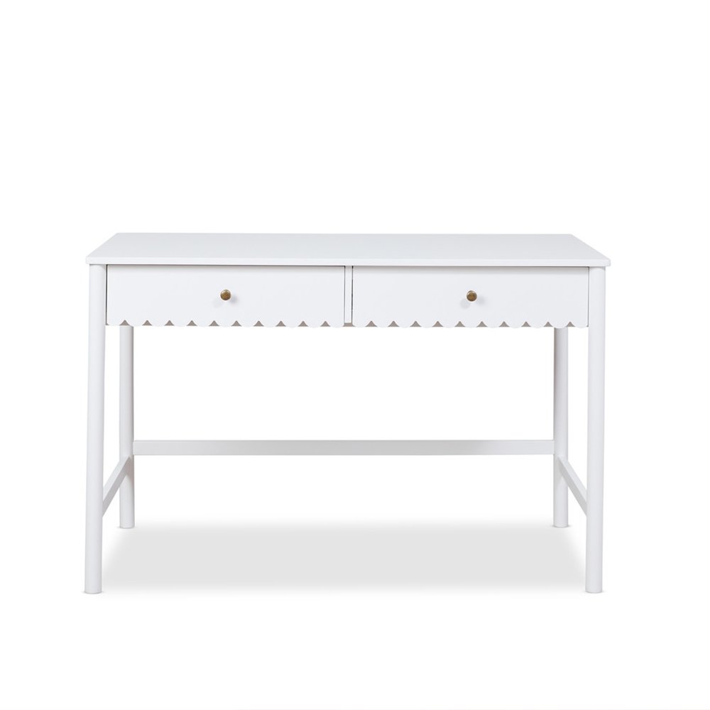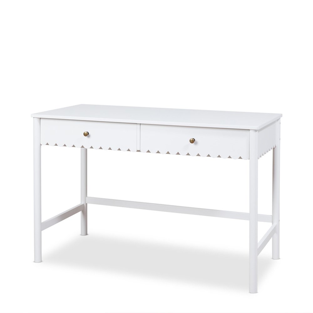 Discover the Lynnhaven Scalloped Desk in White, a blend of classic coastal style with function and innovation. The charming, curved scallop details give this desk a whimsical aesthetic, making it an instant eye-catcher. Designed for those spaces that need the versatility of both functionality and style, this desk is the perfect study companion.
