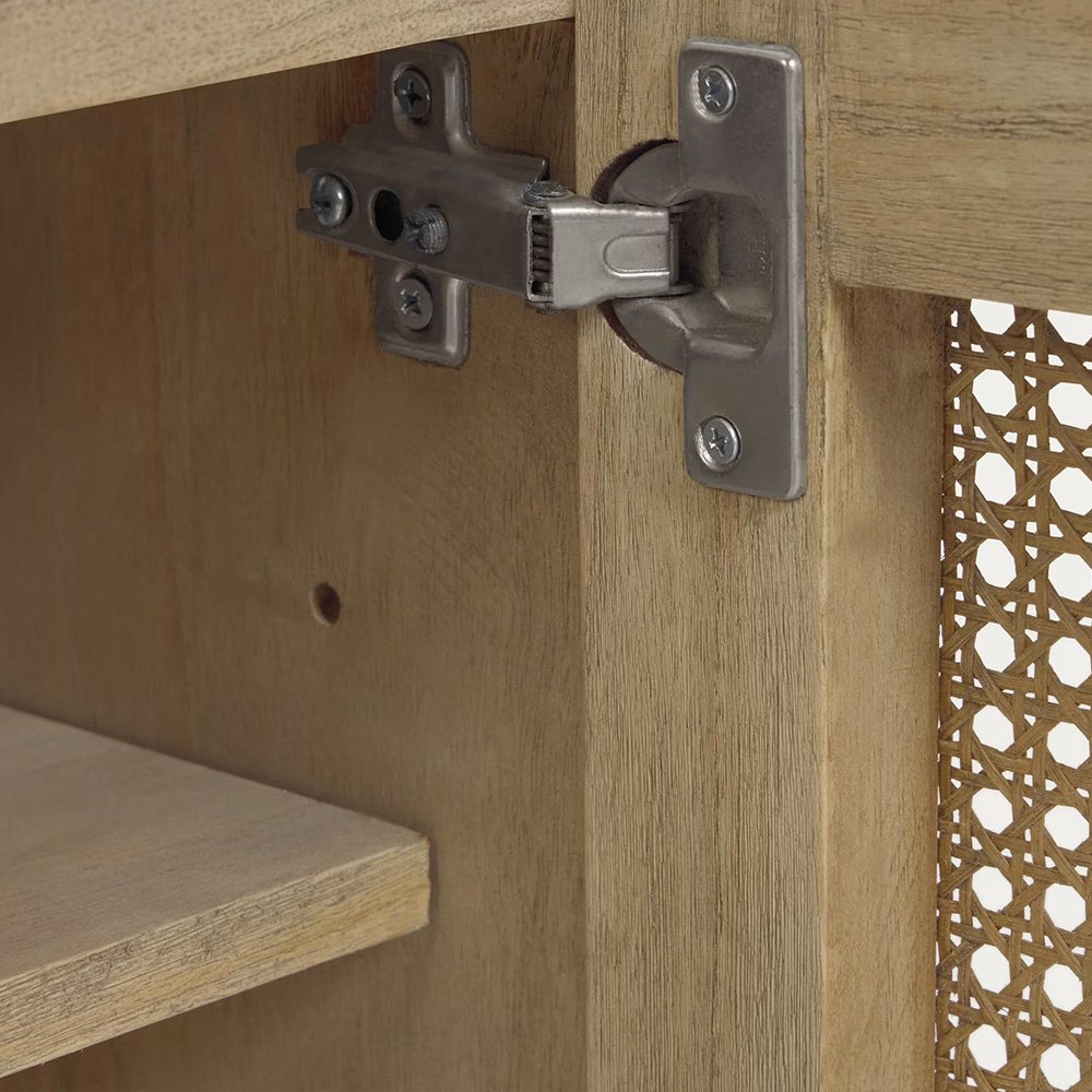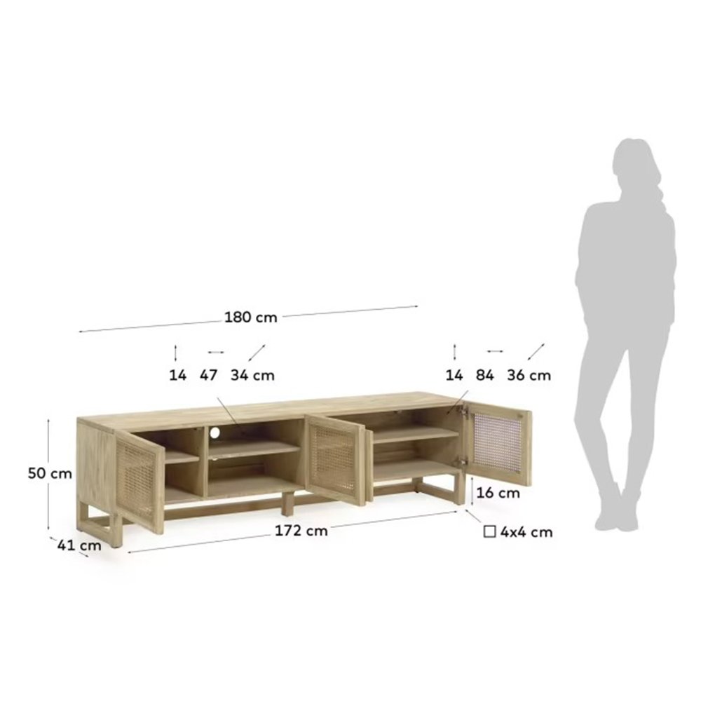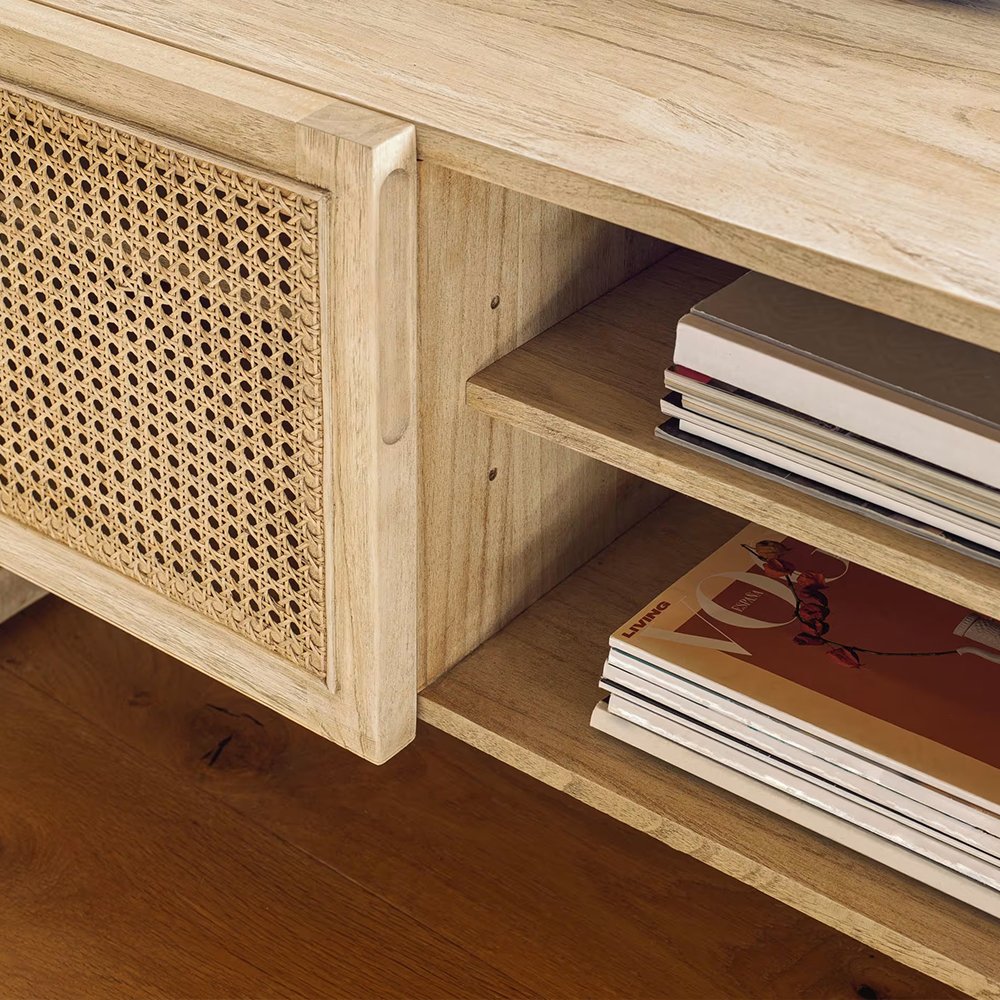 • Solid wood TV stand. Each piece has a braided rattan front and its unique tones and grain from the wood.