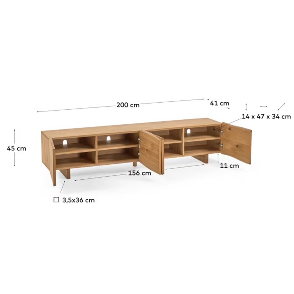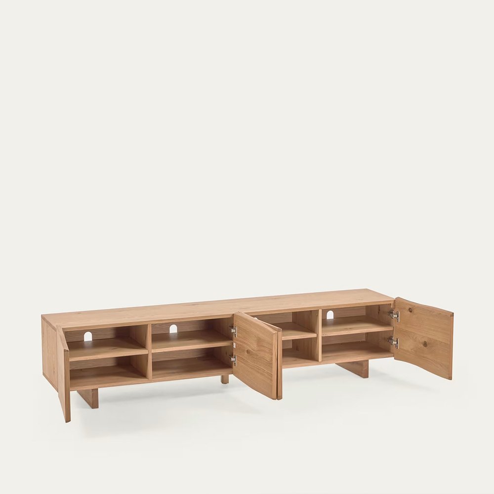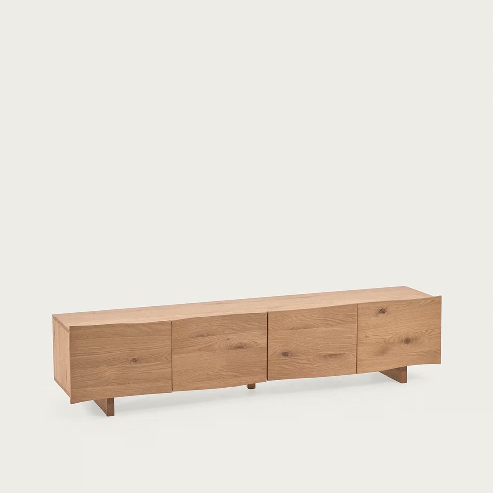 • TV stand with four doors in solid wood with a natural finish.