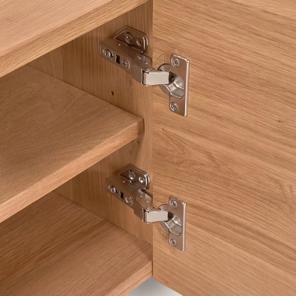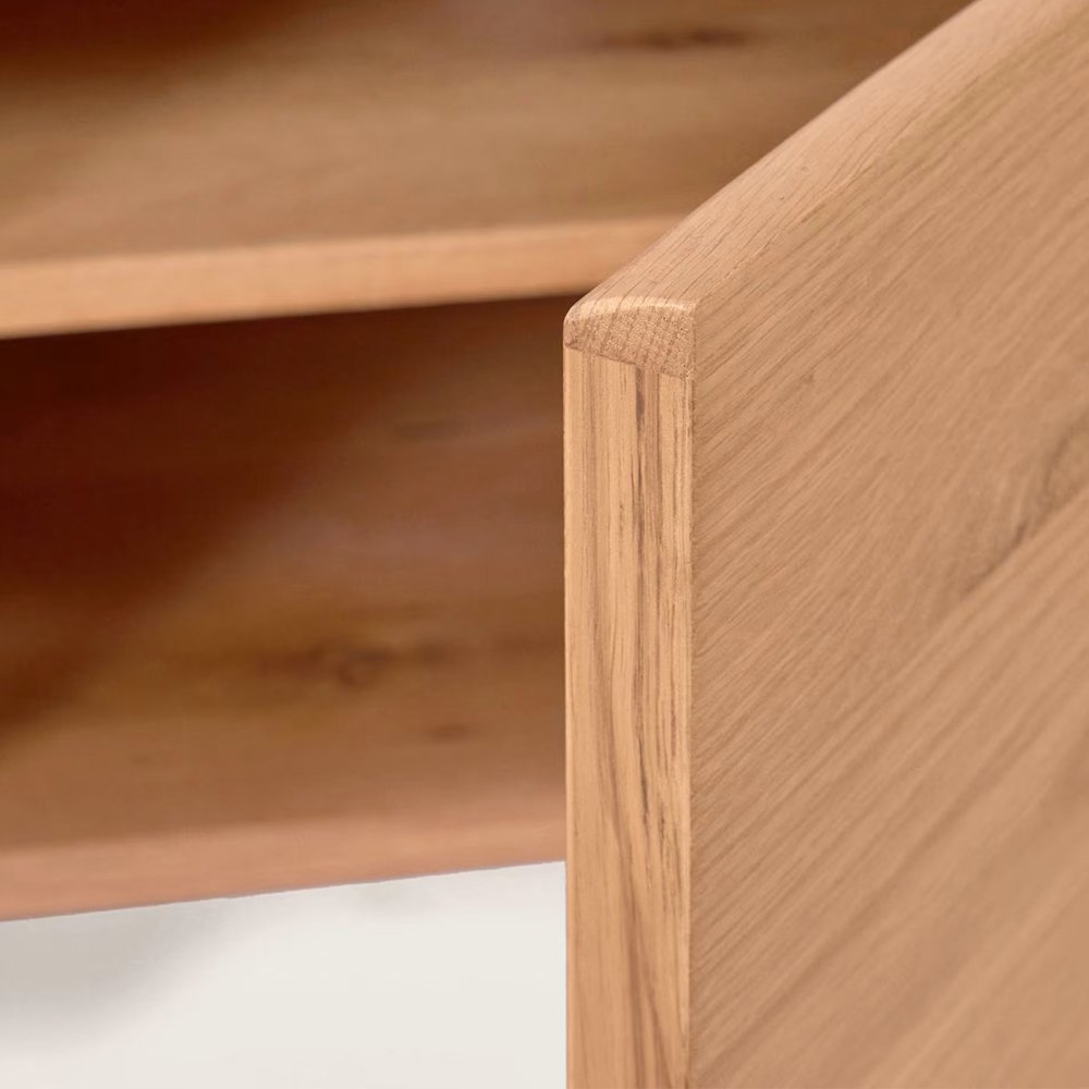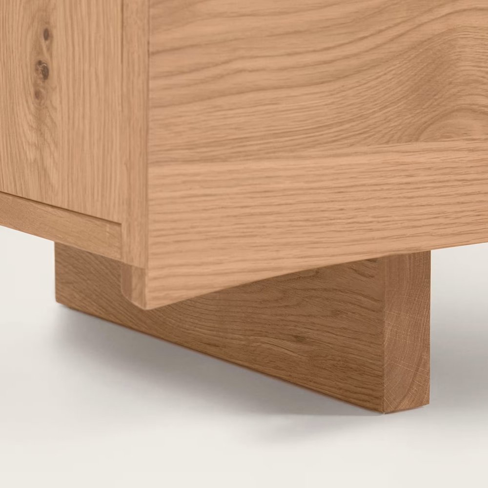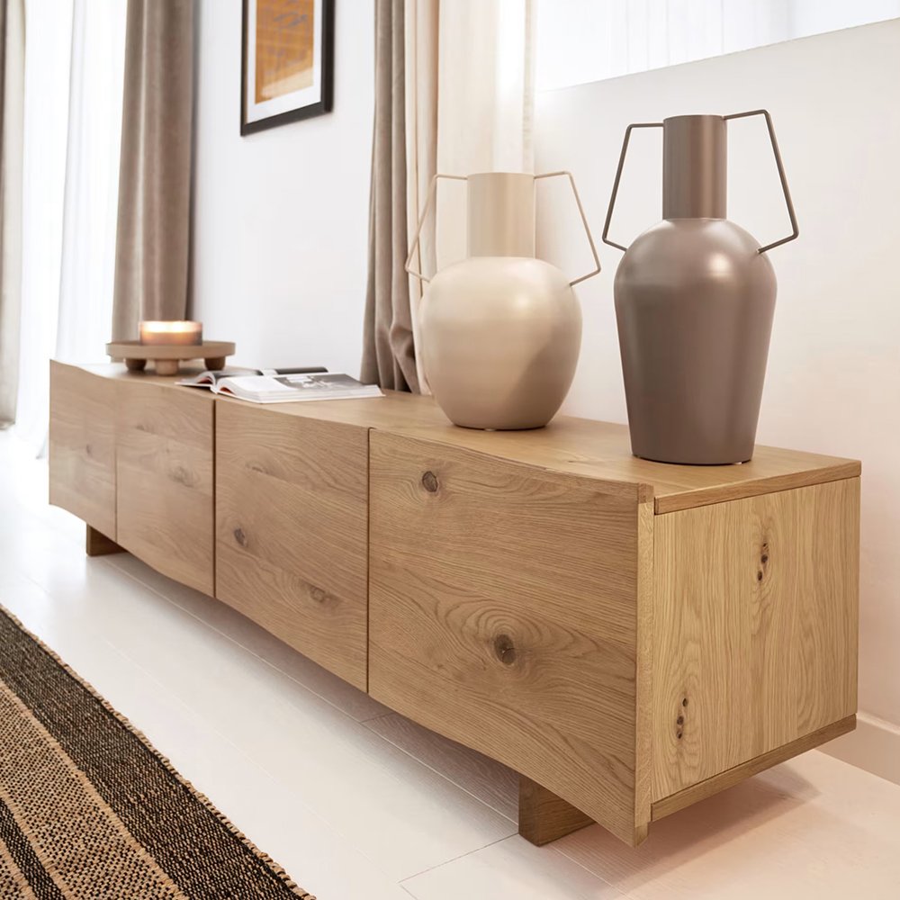 • TV stand with four doors in solid wood with a natural finish.