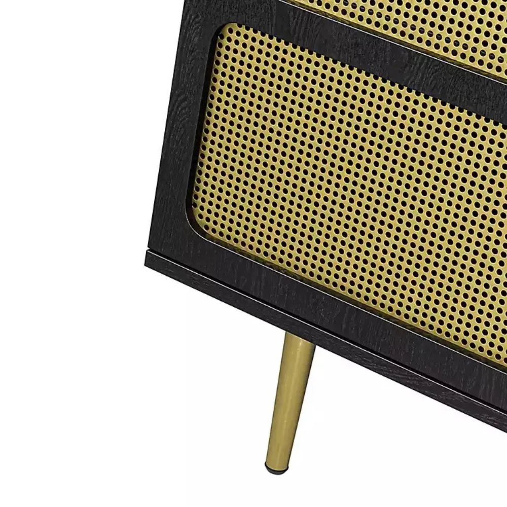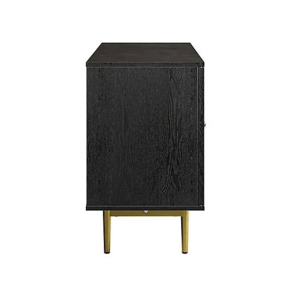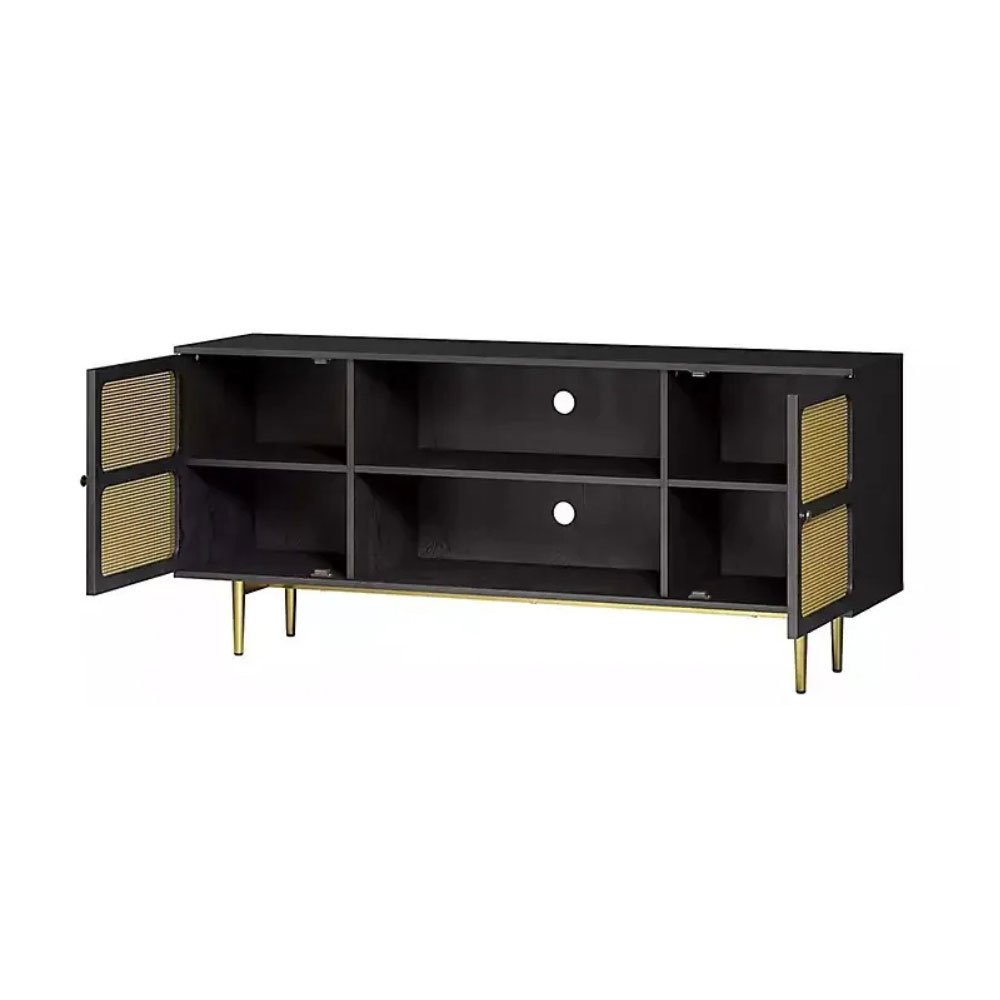 Give your entertainment space a contemporary update with this Black Wood and Gold Juniper Ridge 2-Door TV Stand. The faux cane doors bring visual intrigue to its modern design, while the two tone finish adds a stunning contrast.