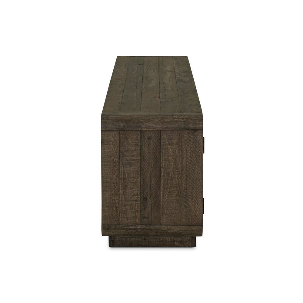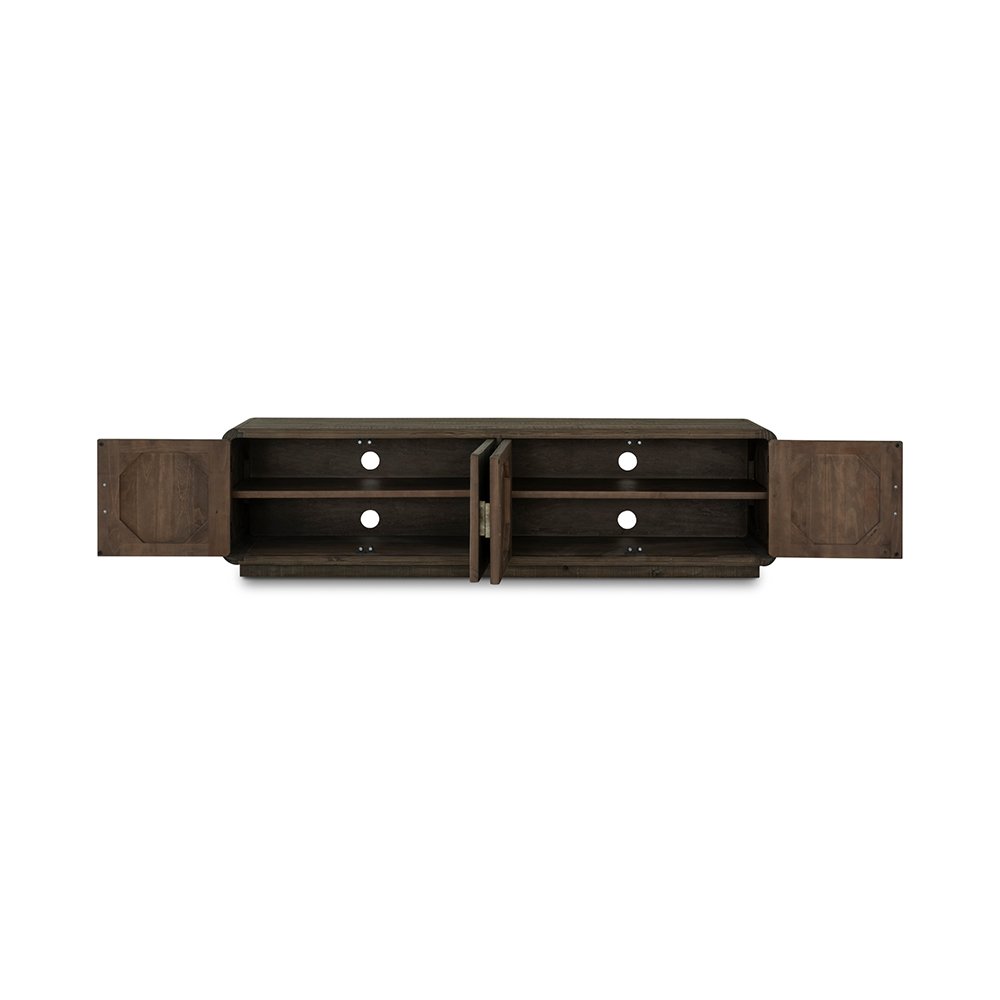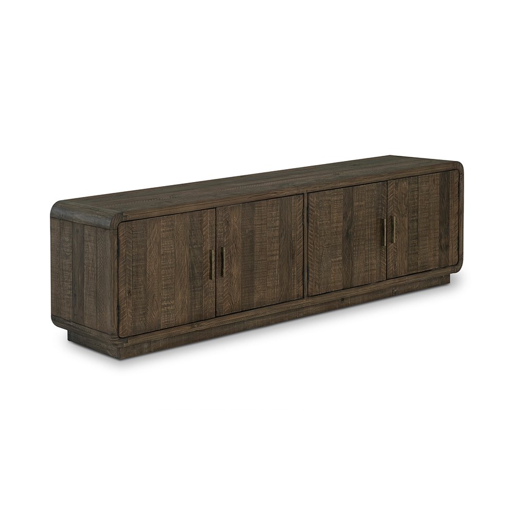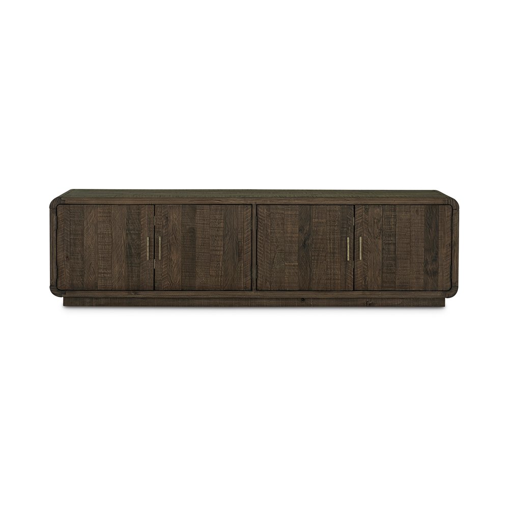 Earthy, on-trend rustic style has been rounded into a minimal silhouette with the Lavish Edge media cabinet. This entertainment cabinet features richly finished solid wood with a matte, driftwood-like finish, blocked base design, and four interior cut-outs for full cable management. With four magnetic catch doors revealing broad storage sections + adjustable interior shelving, this lower storage unit is a rustic knock-out retreat for all your entertainment essentials. A gently curved showcase with a fully finished back, this darkly warming beauty makes for an elegant design off to the side or displayed as a focal point with its confident finish.