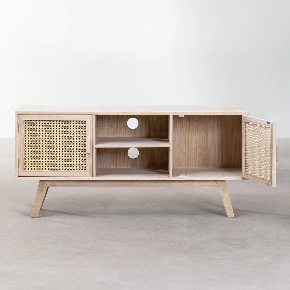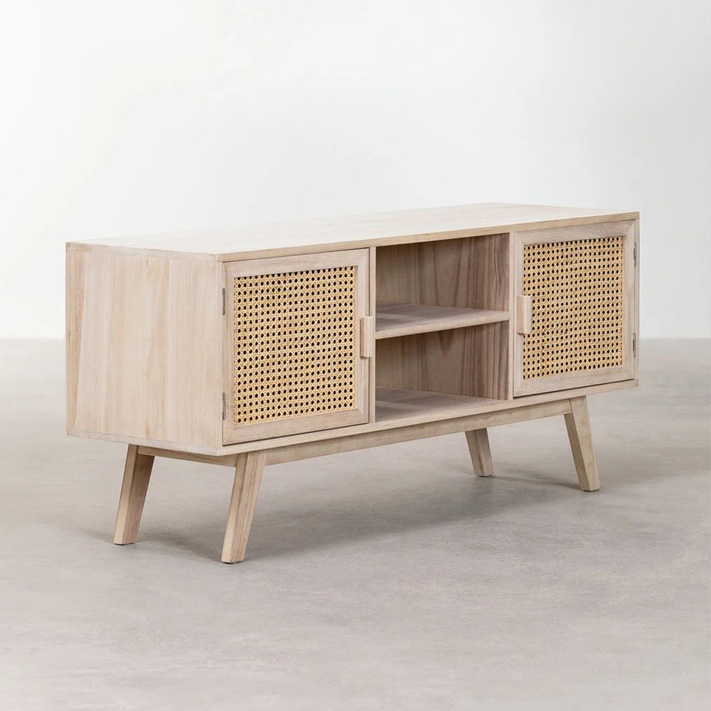 The Ralik Granite Edge solid Wood TV Cabinet is an icon of the renewed vintage style with a natural finish that we love. It is made of robust and resistant solid wood and has three organization spaces, two of them on the sides accompanied by doors decorated with carnage-style rattan and the third located in the center with a shelf. It also includes holes in the back to organize wiring. Functional and practical, it brings elegance and sophistication to your living room.