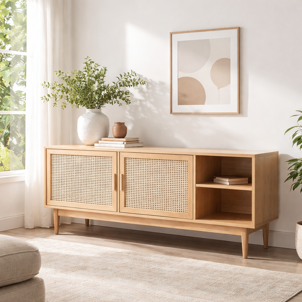 Rivercrest TV Cabinet with 2 Solid Wooden Doors & Light Wood Canework