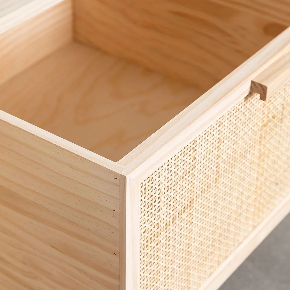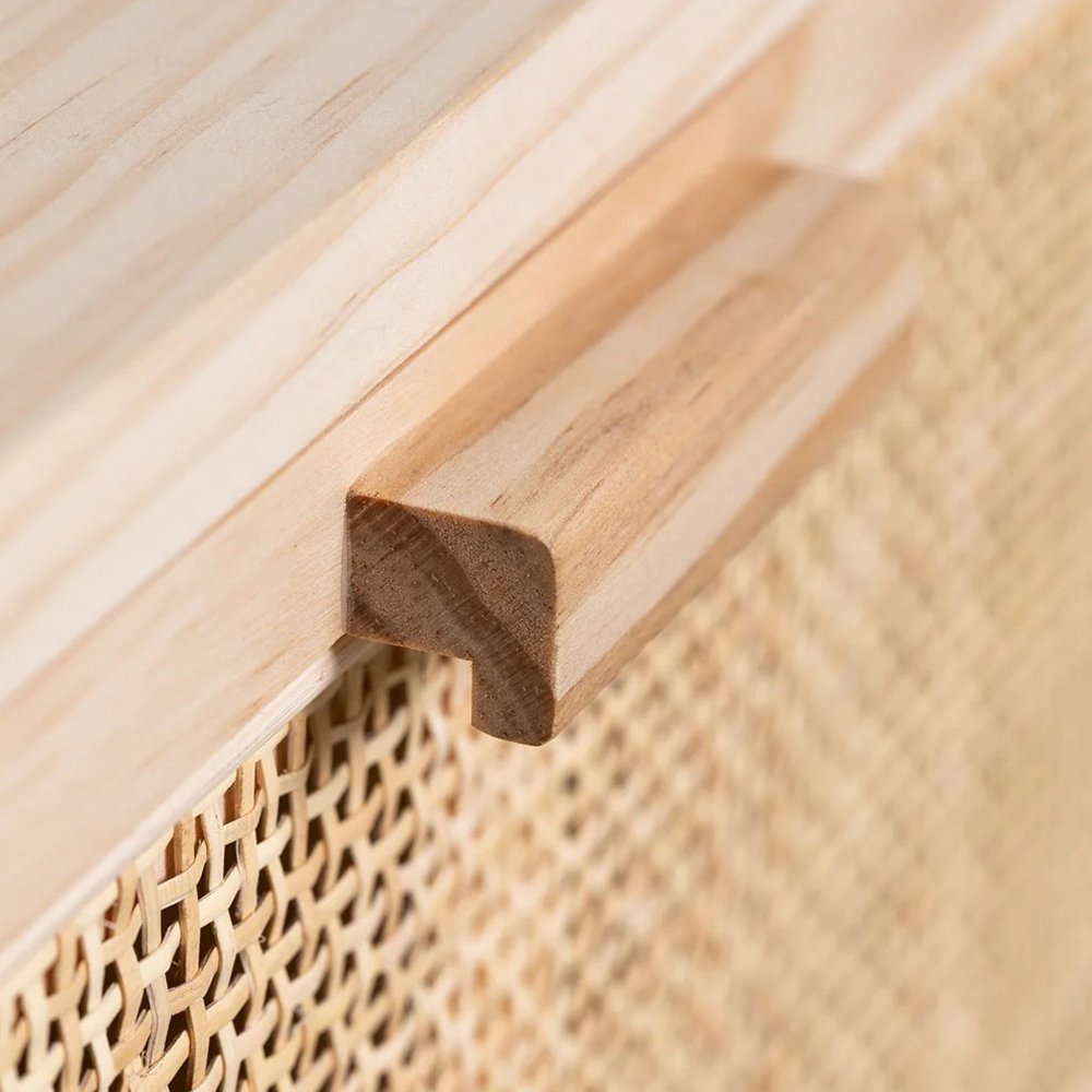 The Rustic Bay Rattan and Solid Wood TV Cabinet is a storage cabinet made of natural solid wood with rattan details. It has 3 large drawers decorated with a handcrafted rattan braid that gives it a very characteristic classic touch. Perfect for placing your television and all the accessories that accompany it in an organized and collected way. Accompany it with the furniture from the Reyna collection, and create original and unique compositions.