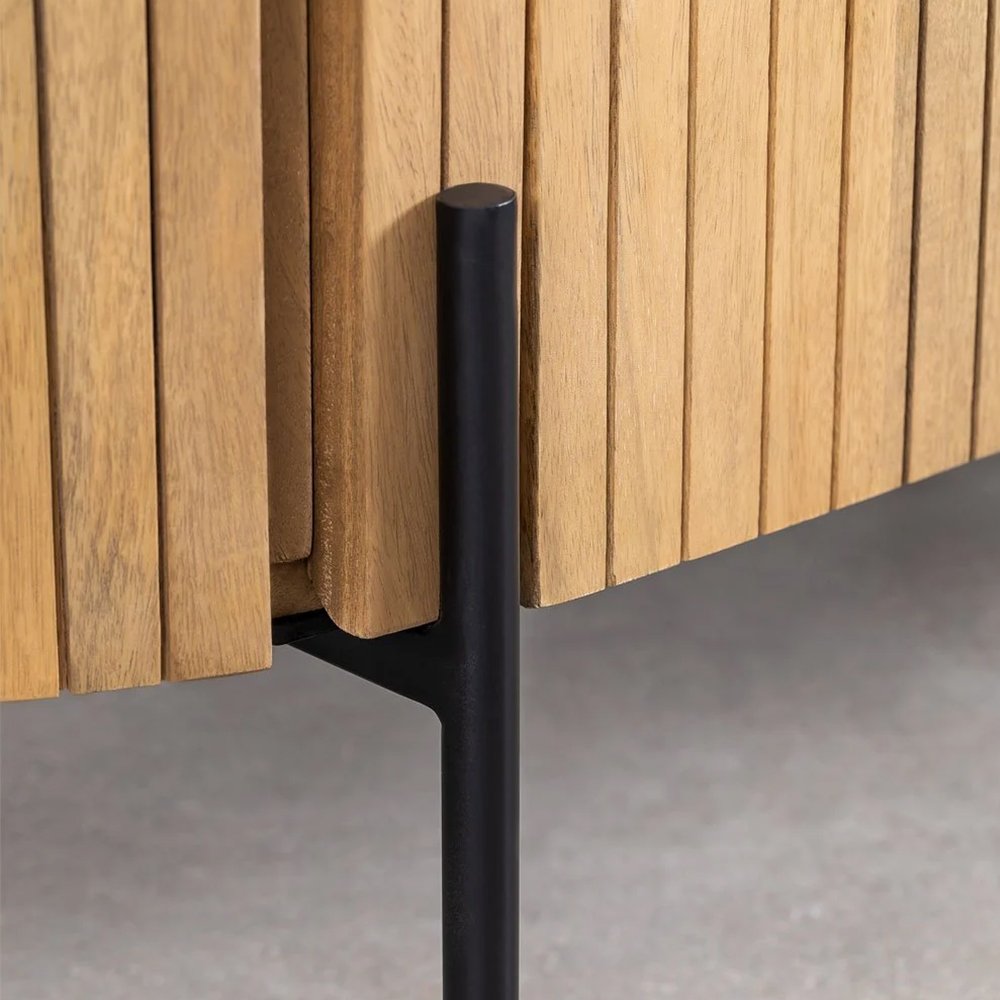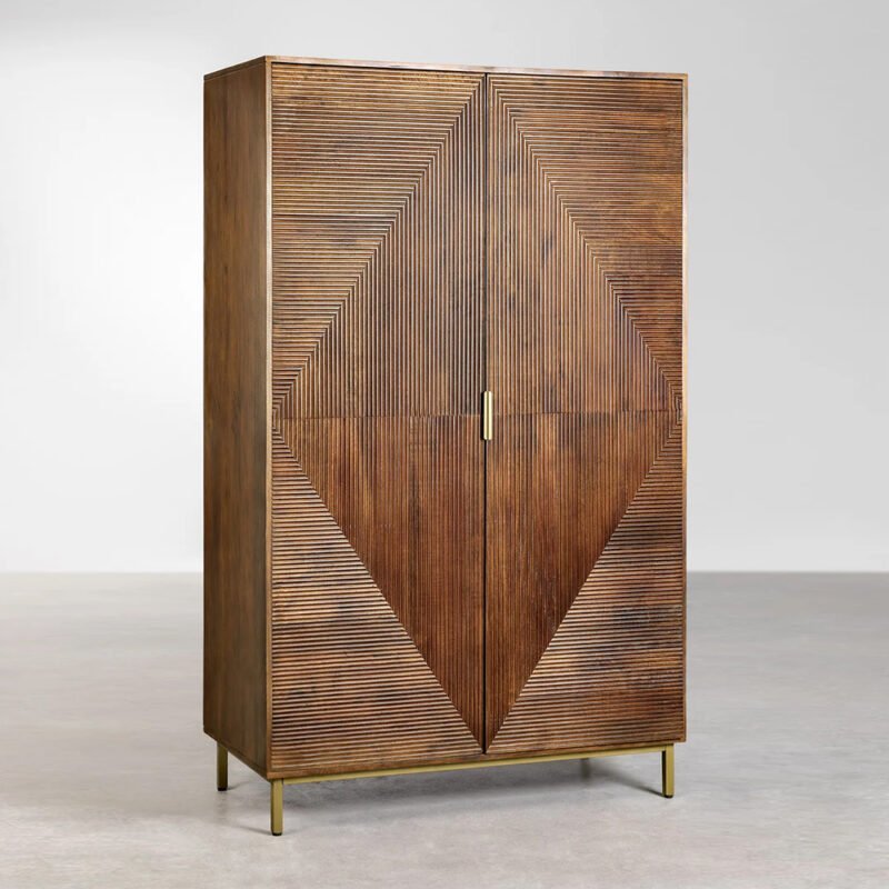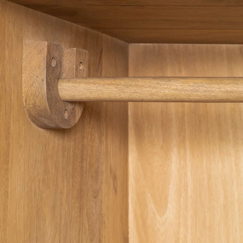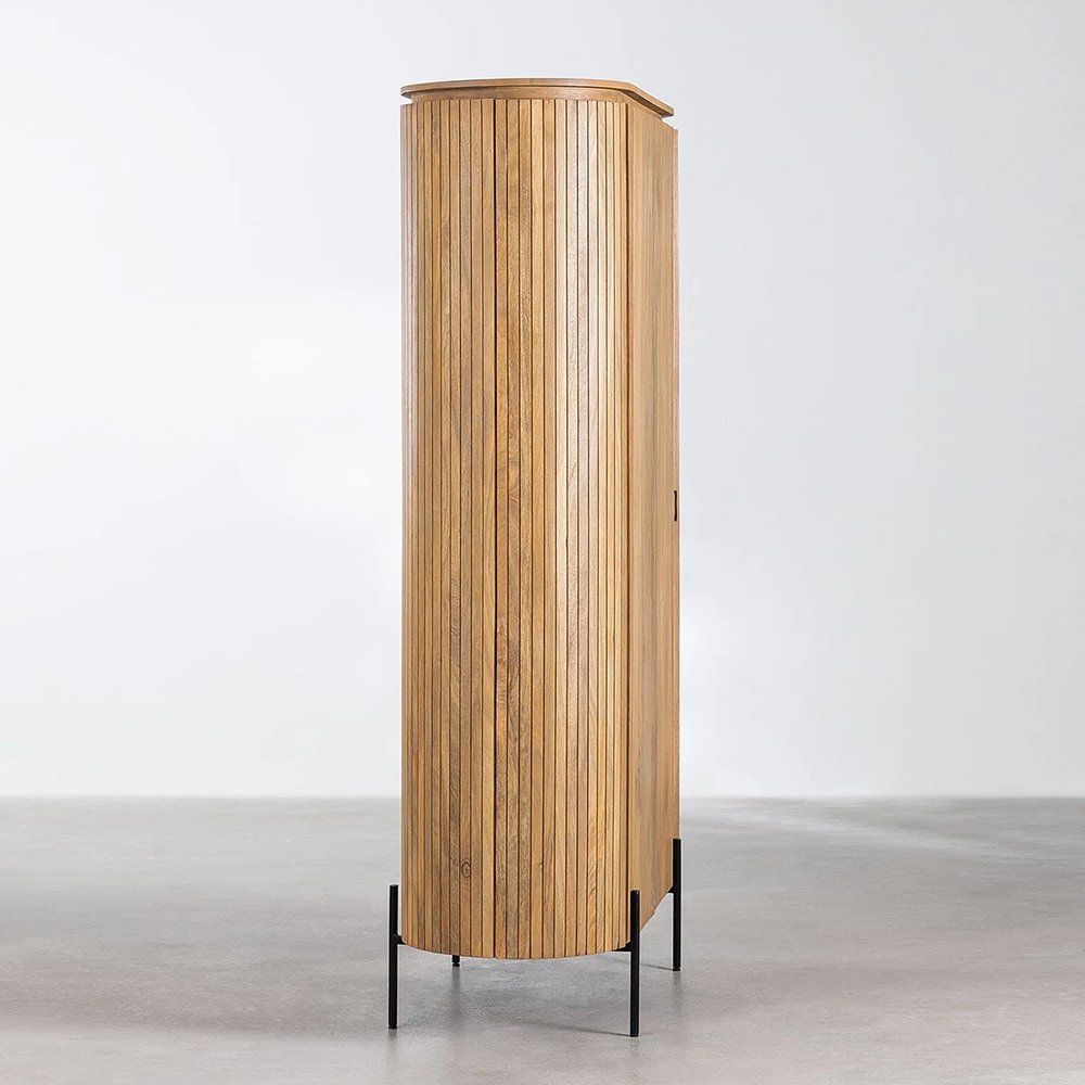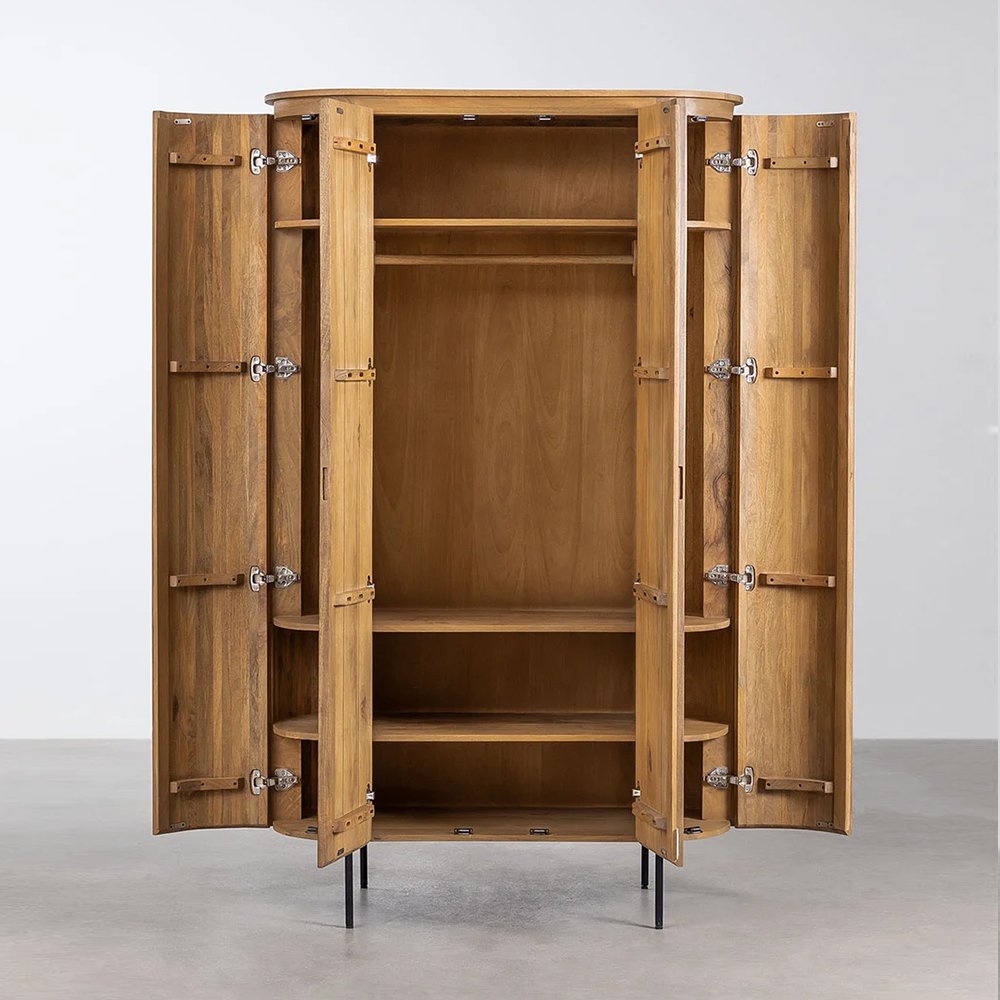 A free-standing wardrobe is an ideal option to keep the most frequently used garments close at hand. The Mango Wood Wardrobe Dunhaven is the piece you were looking for to complete the decoration of your bedroom. Made of mango wood, it provides the necessary resistance and robustness. It incorporates four iron legs, which raise the position of the furniture. It has four doors, which divide the space, making the most of its capacity. It includes three shelves inside to classify the garments according to size and use. Its curved design plays with the color contrast between the natural wood and the black details. Combine the cabinet with other pieces from the Analis collection for a harmonious and polished result.