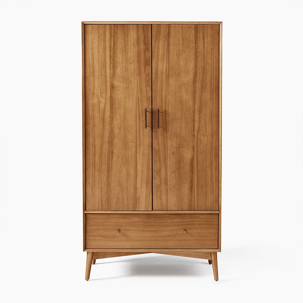 4 adjustable shelves. 2 removable hanging rods. 1 drawer opens on metal glides. 3 metal hooks on an interior door.